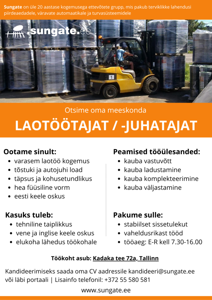 Sungate on kiiresti arenev ettevõte, kus head ideed ja tegijad leiavad rakenduse. Kui tunned huvi meie valdkonna vastu, saada meile oma CV aadressile kandideeri@sungate.ee ja kirjuta, millises rollis sooviksid meiega liituda.