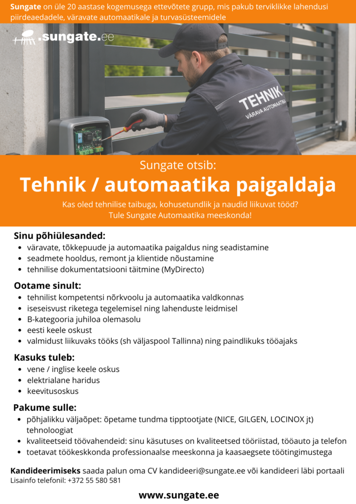 Kui piirdeaedade, turvaväravate, tõkkepuude ja automaatika sektor pakub sulle huvi, siis vaata allolevaid võimalusi ja liitu meie meeskonnaga.